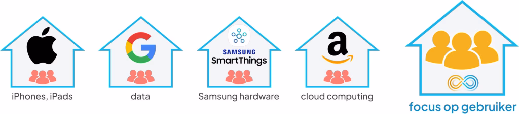 Big tech zullen nooit het ideale smart home realiseren. Apple & Samsung willen bijv. eigen hardware verkopen, Google data. Wil je dat jouw smart home beperkt wordt door hun bestaande businessmodellen? Helaas zullen de meeste mensen de big tech systemen over enkele jaren “goed genoeg” vinden. Tot die tijd heeft EvoLink de kans om een beter Europees alternatief te introduceren. Gemaakt in Nederland.