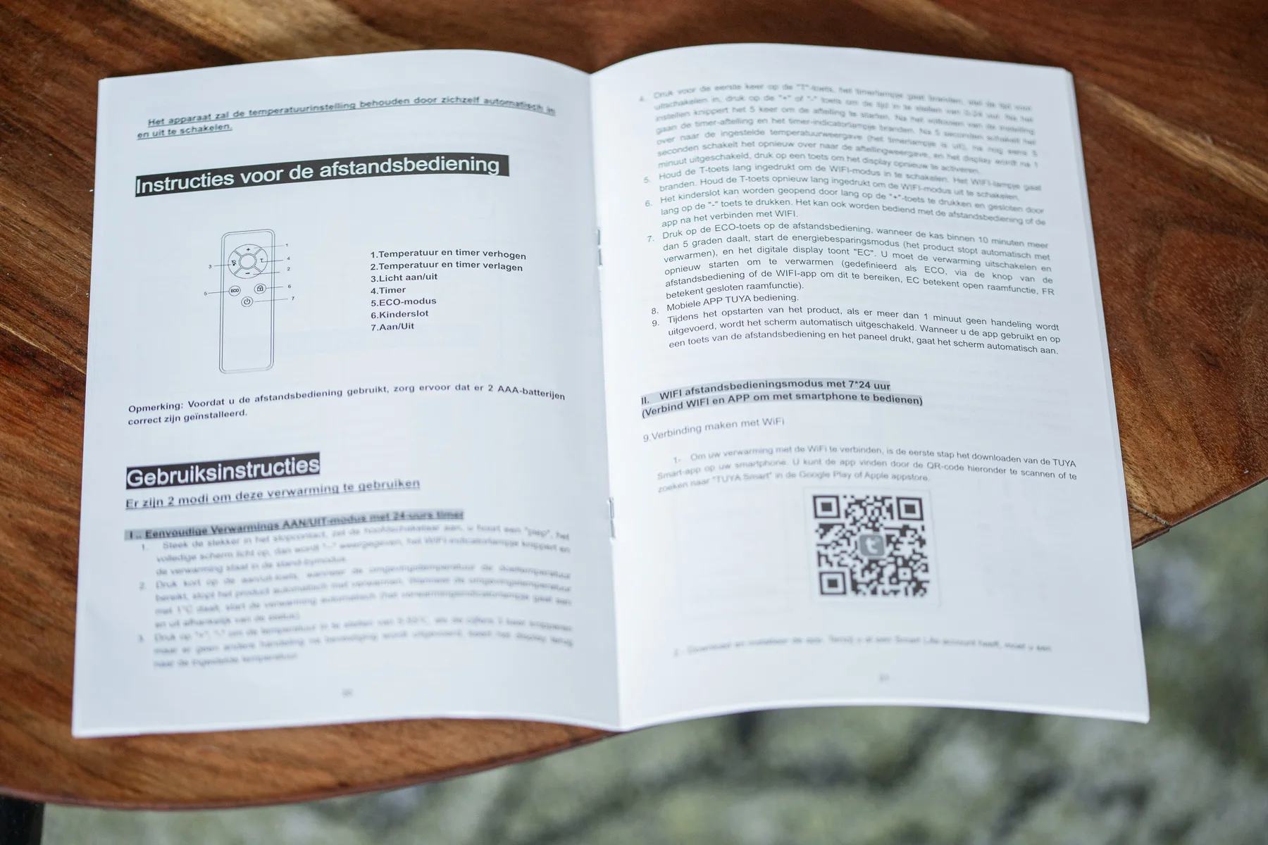 Het handleidingen boekje in het Nederlands verteld duidelijk hoe je de infrarood verwarming opstart. Zodra hij in het stopcontact gaat en elektriciteit heeft is hij in principe te gebruiken met de toetsen aan de zijkant van het glazen paneel. Maar hij is ook te verbinden met de Wifi om te kunnen integreren in je smarthome.