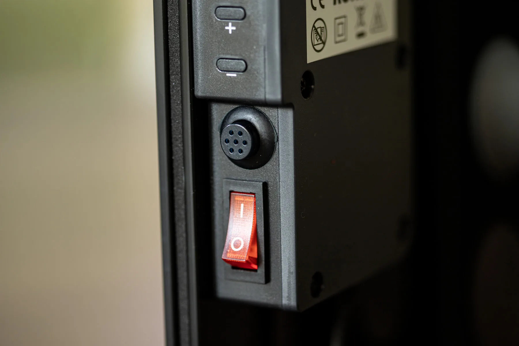 Net boven de aan/uit knop zie je de ingebouwde thermostaat. Zijn taak is het meten van de omgevingstemperatuur om vervolgens te regelen hoeveel warmte er gemaakt moet worden. Sommige andere kachels hebben een draadloze wifi thermostaat, zodat de temperatuur ver weg van de kachel gemeten kan worden. Nou heeft dat voor infraroodpanelen minder zin, aangezien de ruimte niet wordt verwarmt, slechts de directe omgeving ervoor.