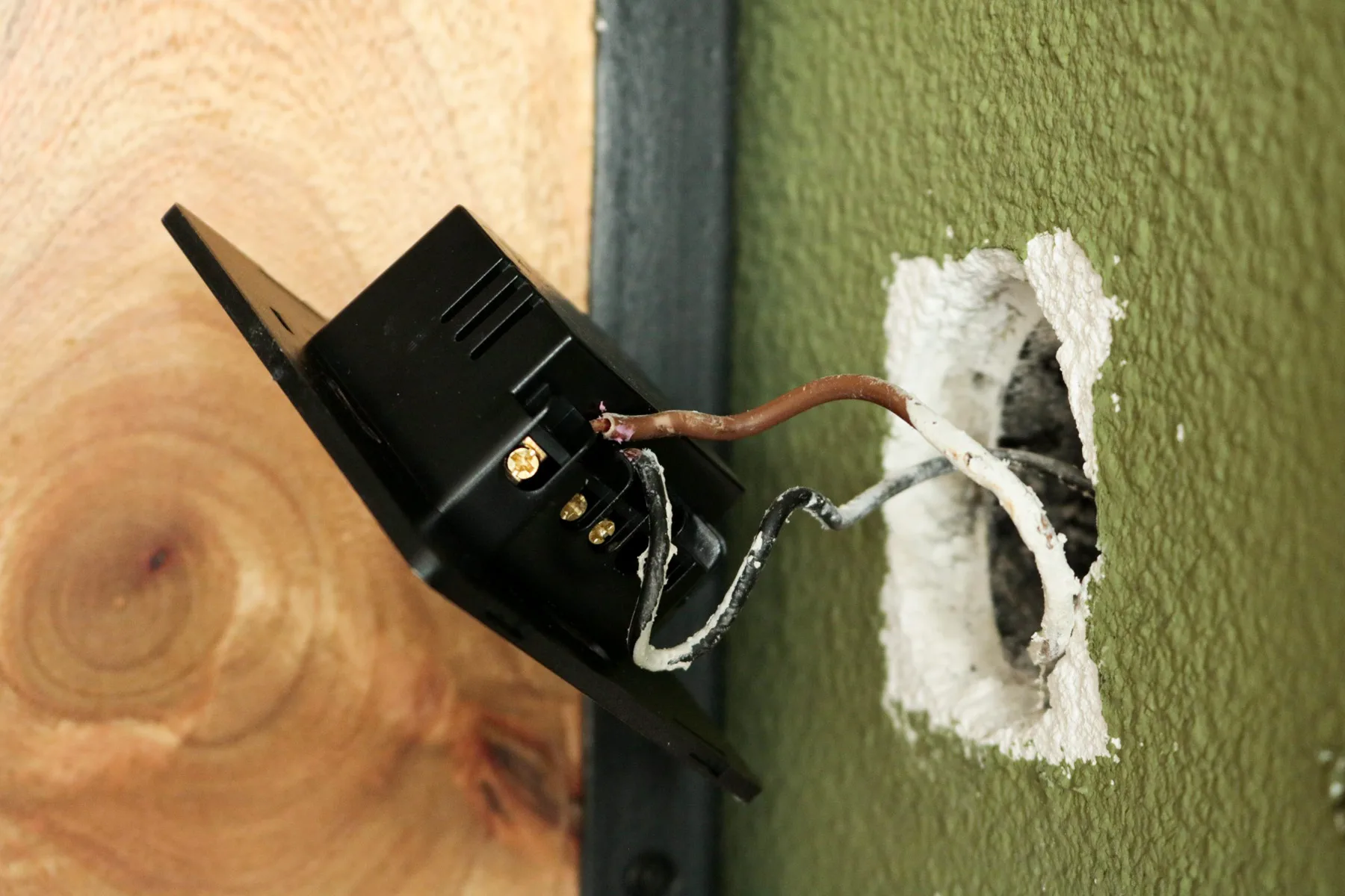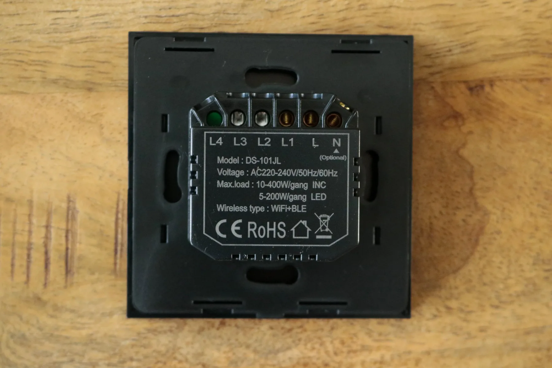 Het aansluiten van de slimme schakelaar zelf is eerder in dit artikel uitgelegd. Het bruine fase-draad gaat in ingang L en het zwarte schakel-draad gaat in L1. Verder is het een kwestie van netjes afwerken van de schakelaar in de muur.