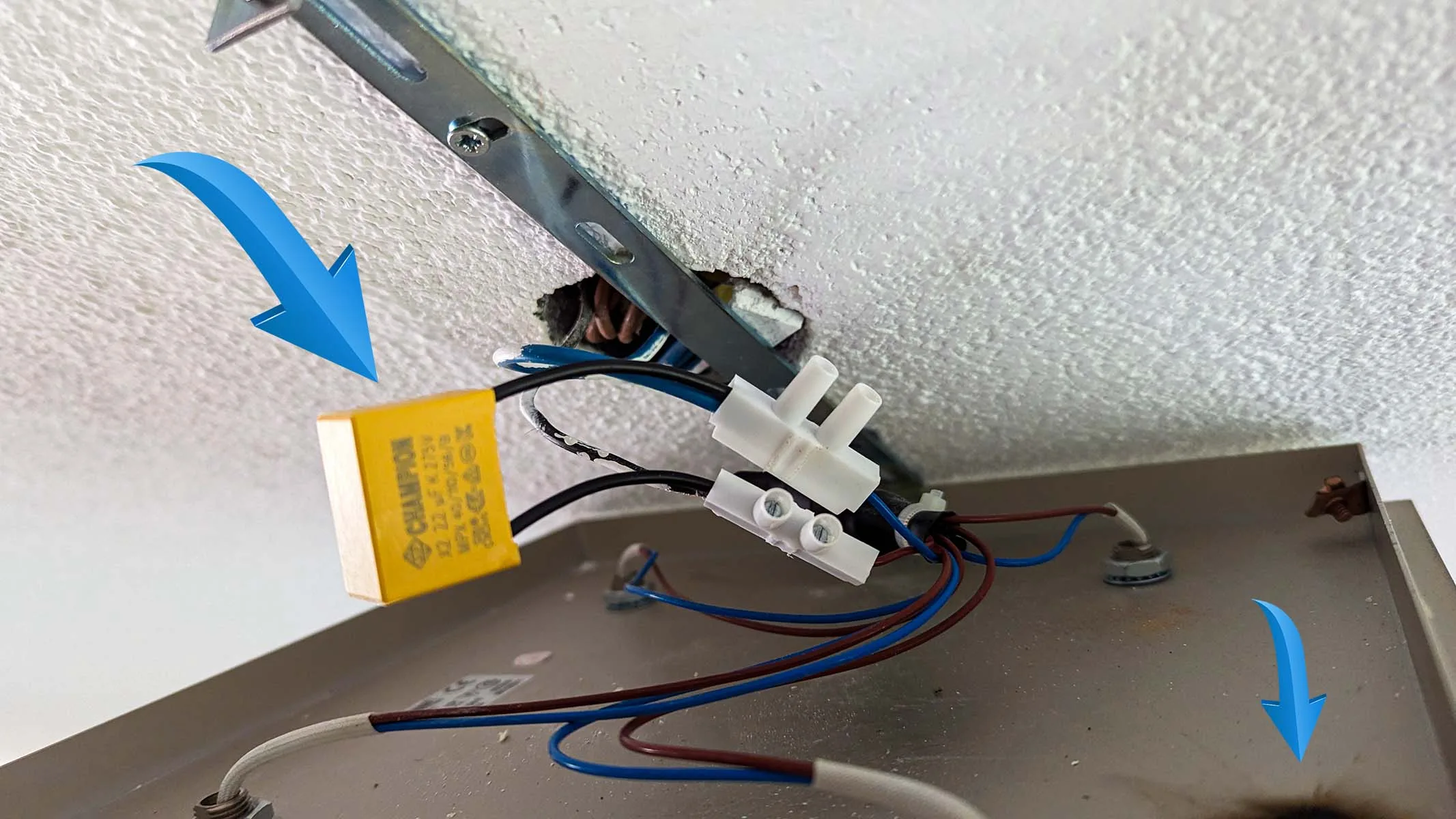 Als eerste sluiten we de anti-flicker module aan. In deze volgorde kunnen we direct controleren of de schakelaar werkt wanneer we deze in de volgende stap hebben aangesloten. Er staat op de anti-flicker module geen + of – teken, dus we hebben hem eerst even doorgemeten met een multimeter alvorens het aansluiten. Zoals afgebeeld moet de module parallel tussen het schakeldraad en de nul-draad. Dat ziet er in de praktijk zo uit: