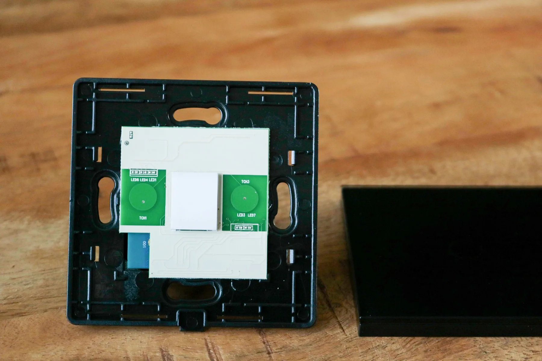De binnenkant van de slimme schakelaar, zonder het glazen plaatje