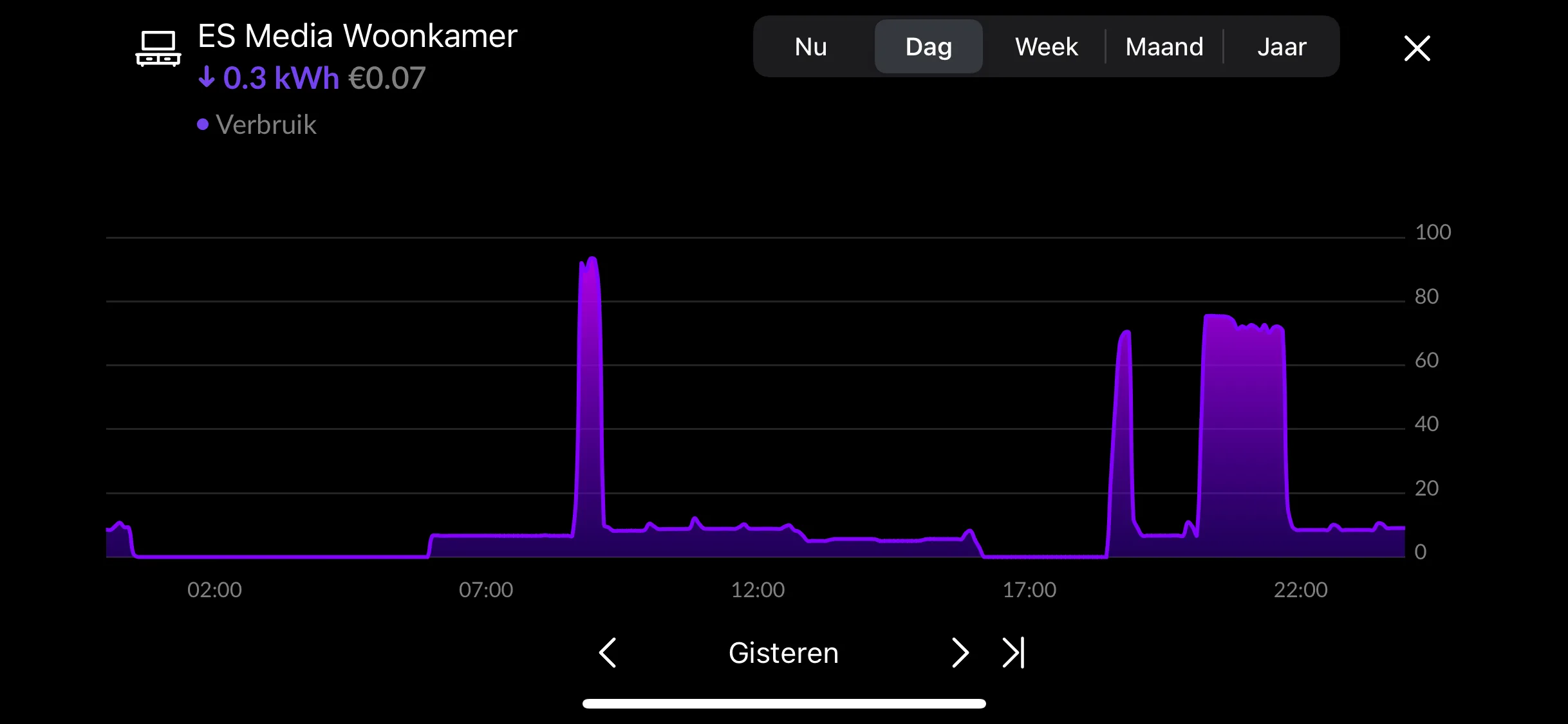 De Meettaak geeft jou de mogelijkheid om de slimme stekker aan- of uit te zetten bij een bepaalde meting. Mocht je jouw televisie hebben gekoppeld met de slimme stekker dan kan je deze automatisch uitschakelen, wanneer je televisie minder dan 40Watt verbruikt.
